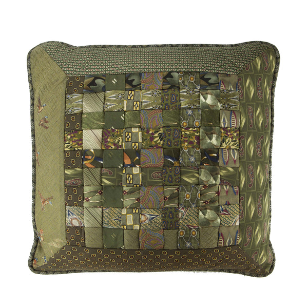 Woven Silk Necktie Pillow in olive and sage green hues backed in a 100% wool (possibly cashmere) in sage green with olive and light green stripes. Sweater banding is used in pillow backing as an added detail. Custom piping and welting...